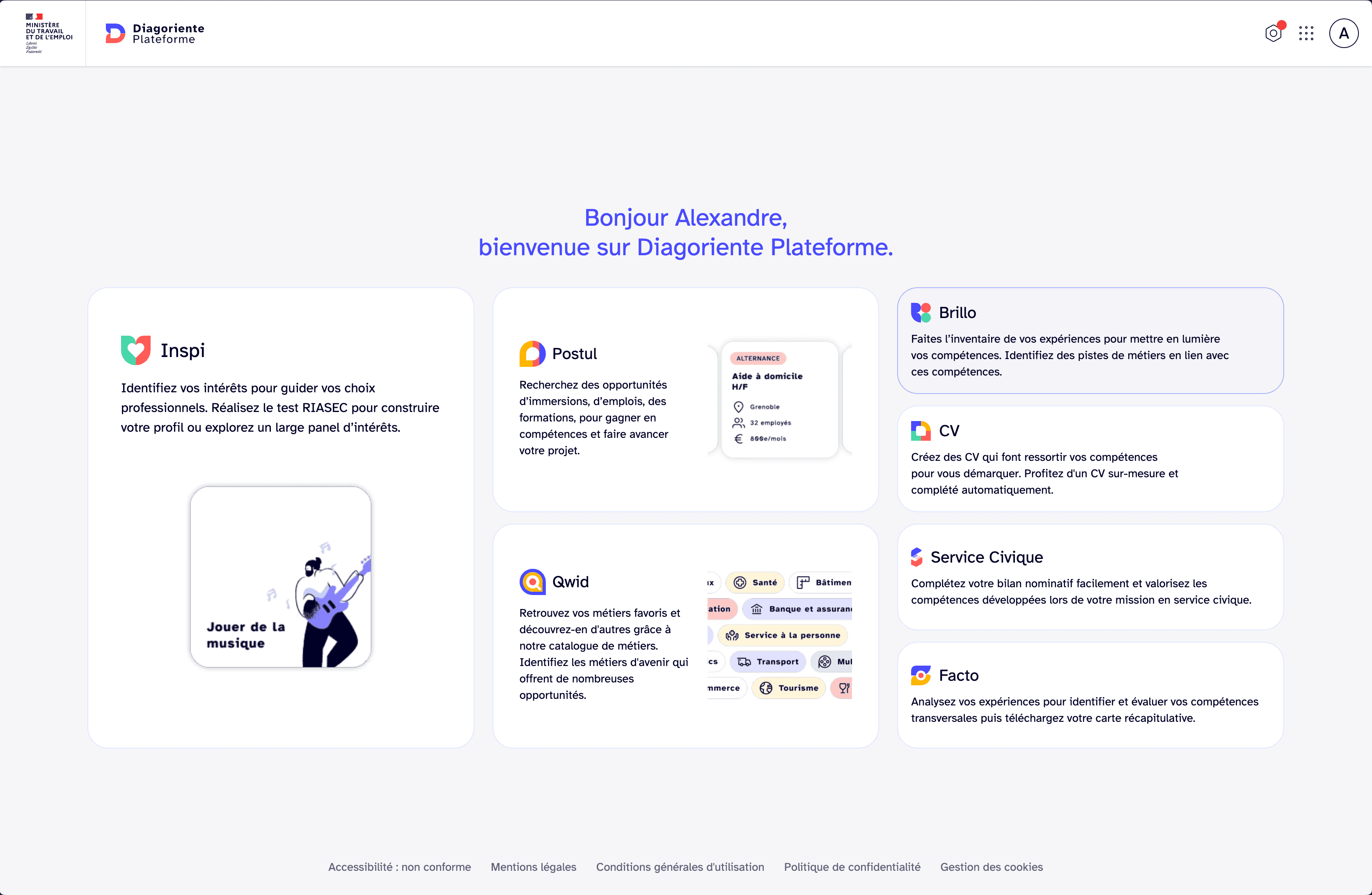 Service public d'orientation professionnelle, Diagoriente est une plateforme gratuite et ouverte à tous pour valoriser ses compétences et trouver des pistes de métiers selon ses intérêts.