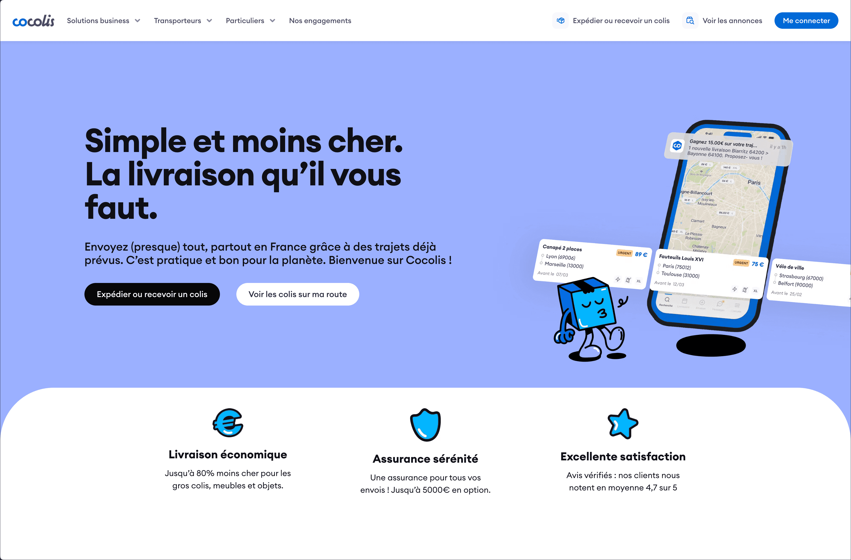 Solution de livraison collaborative qui s’appuie sur une communauté de livreurs particuliers et professionnels. Cocolis permet des livraisons moins chères et plus écologiques.